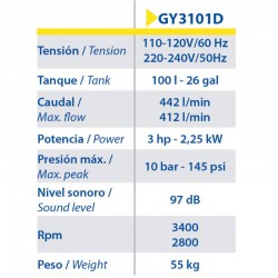 El Compresor Eléctrico Goodyear GY 3101D es la herramienta ideal para profesionales y aficionados que buscan potencia, fiabilidad y gran autonomía de trabajo. Con su tanque de 100 litros y un caudal de aspiración de 442 L/min, podrás realizar trabajos prolongados sin interrupciones.